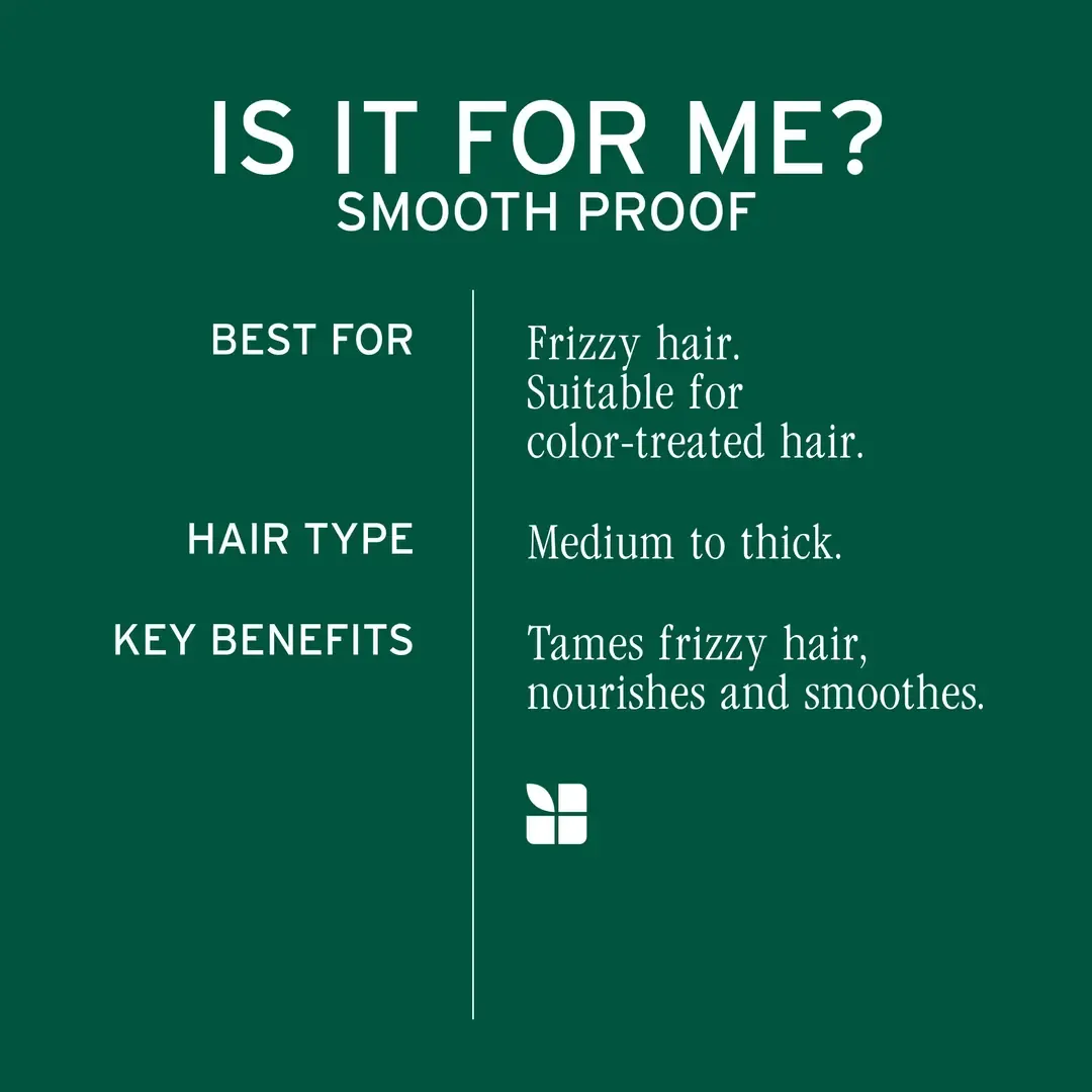 After shampooing, apply to wet hair and distribute through mid-lengths and ends. Leave for 1–3 minutes, then rinse thoroughly. For best results, use with Smoothproof Shampoo as part of your frizz-control routine.